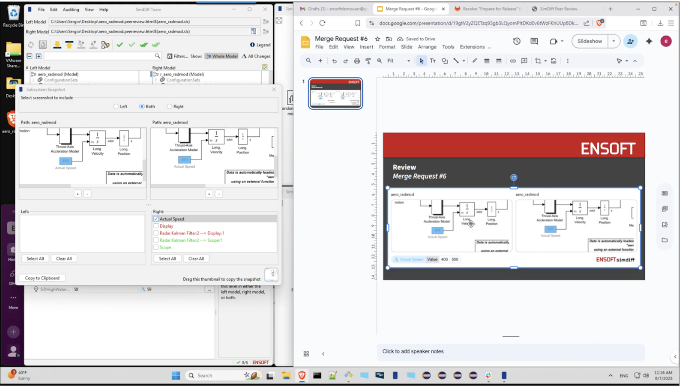 Suppose that you see a change in the model that you would like to make a comment on the merge request. In this case, a display block was replaced by a scope block. You can go to the merge request and make a comment about it - “We should always use scope block here”, for example - and we can use the Subsystem Snapshot feature in SimDiff to add a snapshot of that change.