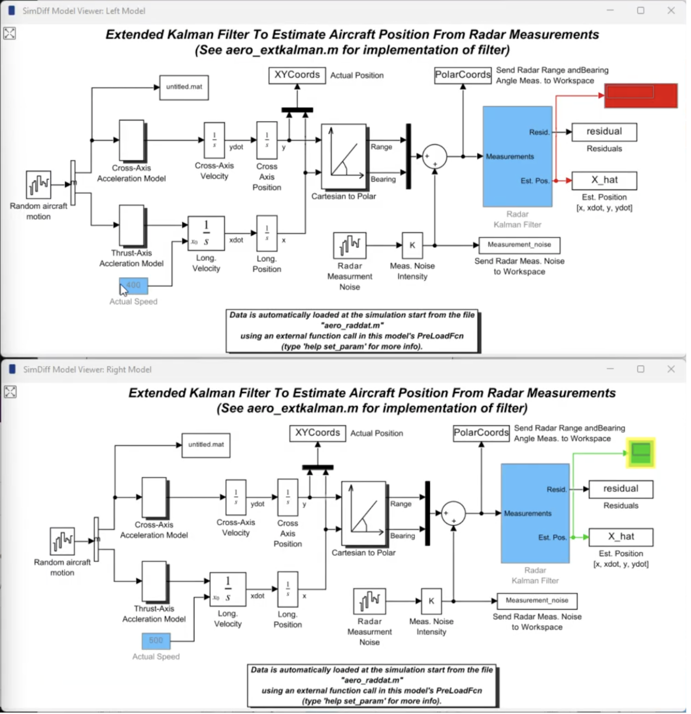This signal is connected to the Terminator block, and also to a port that doesn’t yet exist in the output model’s Kalman Filter. What happens if you try to merge it using SimDiff? SimDiff detects the dependency and creates the third out port that you need.