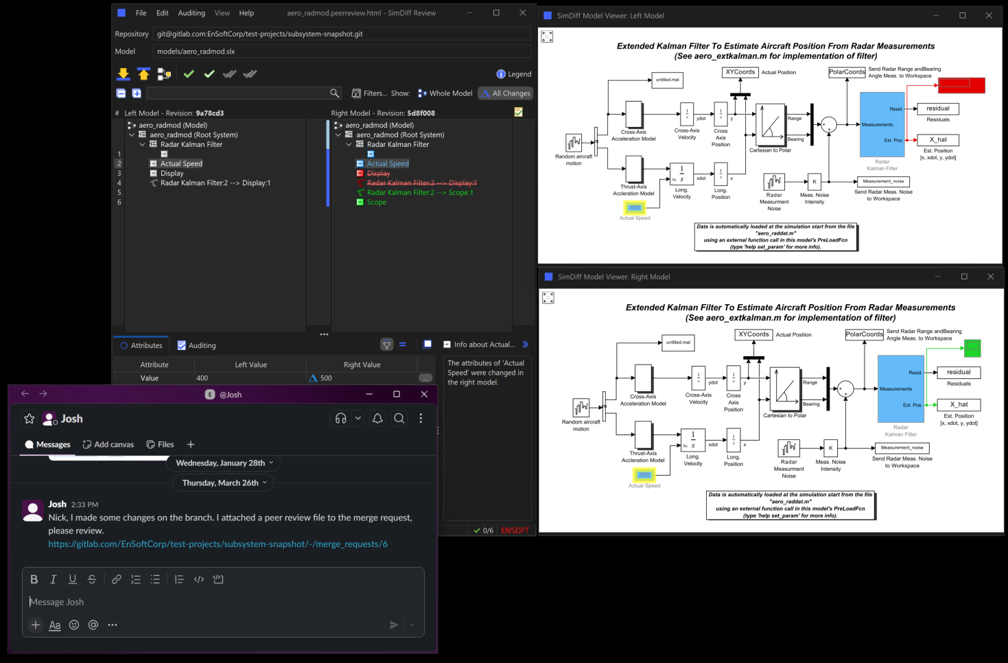 Picture this: you get a chat message from a colleague asking you to review some changes in a merge/pull request where he included a Peer Review file. You can open the peer review file in SimDiff to easily and graphically glance at the changes by using SimDiff’s model viewer. Note that you don't need a Simulink license nor MATLAB installed to visualize the model.