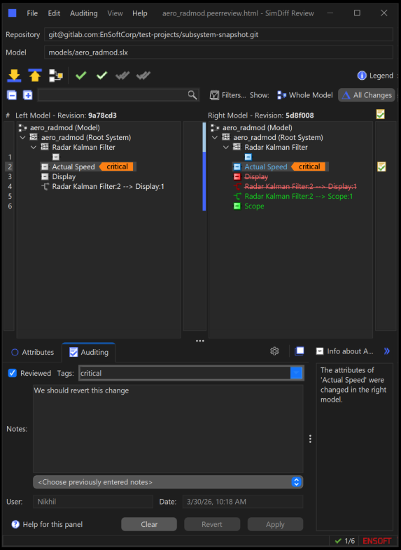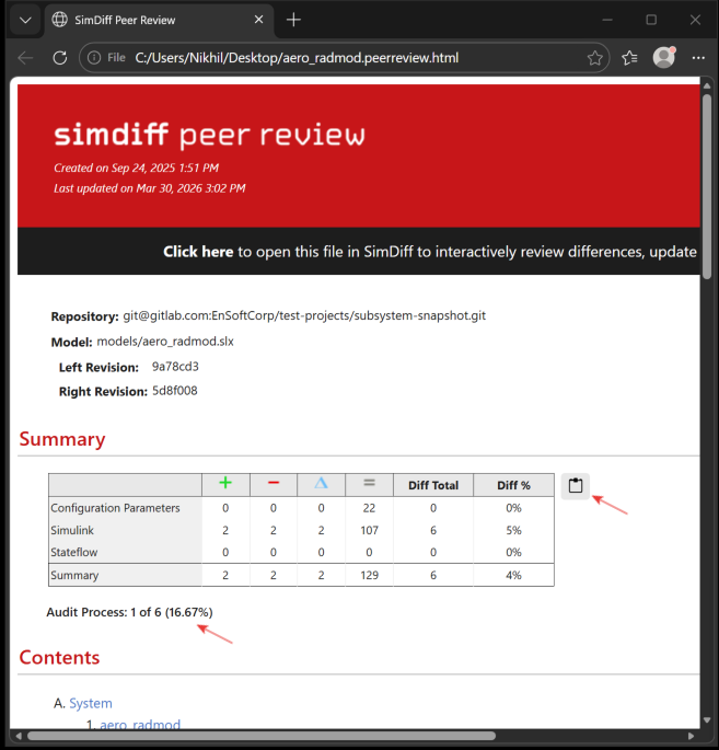 SimDiff Review supports fast graphical exploration of changes (via an embedded HTML-based model viewer), incremental auditing, notes/tags, progress tracking, and targeted visual summaries — all optimized for peer reviews, merge/pull requests, audits/compliance, and DevOps workflows.