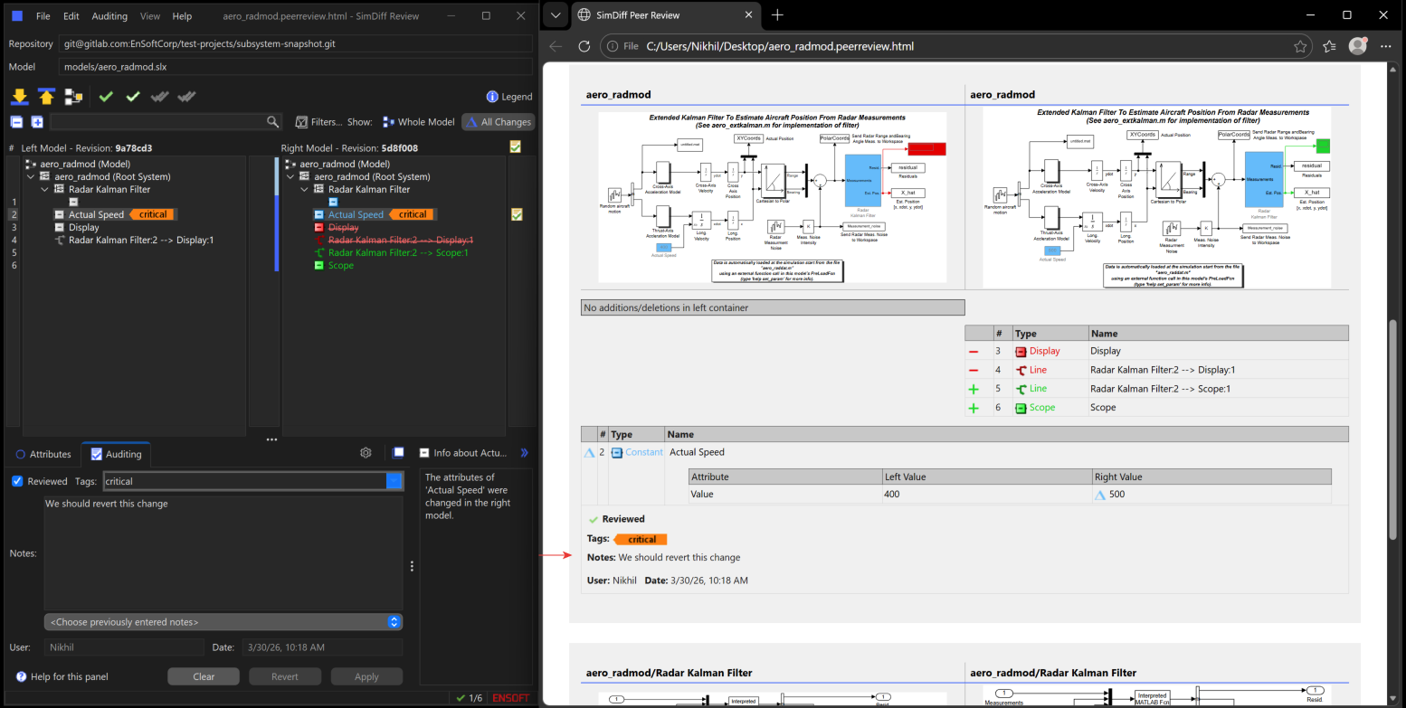 SimDiff Review enables interactive visual review of changes in Simulink models through self-contained Peer Review Files — making it easy for large teams to collaborate on model differences without requiring reviewers to have a Simulink license or to even have MATLAB or Simulink installed.